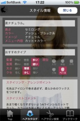 表示されたヘアースタイル写真をタップすると、フロント、サイド、バックからの写真に加え、ヘアースタイルに関する詳細情報を見る事が出来ます。