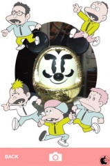写真フレームの抜き部分に被写体を合わせながらカメラボタンをタップして写真を撮影します。
