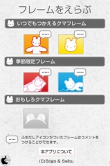 アプリを起動して、クマフレーム、季節限定フレーム、おもしろクマフレームの中から好きなフレームを選択します。