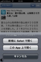 Twitterボタンをタップすると、このアプリからツイートするか、Safari経由でツイートするか選択することが出来るようになっています。