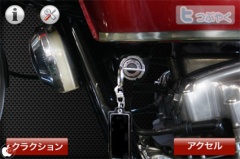 アプリを起動すると、スタータースイッチ画面が表示されるので、カギの部分をタップすると、画面下にクラクション、アクセルボタンが表示されます。