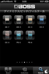 Searchをタップすると、BOSSコンパクト・エフェクターが全シリーズ表示され、それぞれのエフェクターのサンプルサウンドを視聴することが出来るようになっています。