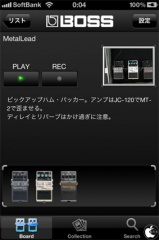 このアプリは、実際に持っているエフェクターの組み合わせを記憶し、そのエフェクターの組み合わせで鳴らしたギターサウンドを録音することが出来るアプリで、PLAYボタンをタップすると、サンプルサウンドが鳴ります。