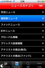 ニュースをタップすると、市況、個別株、ファンド、グローバル情報、レポートや動画などといったカテゴリーが表示され、それぞれのカテゴリーに分類されたニュースを見る事が出来ます。