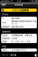ピンをタップすると駐車場名が表示され、さらにタップすると駐車場の詳しい情報を見る事が出来ます。