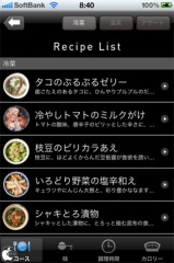 レシピリストを選択すると、コース(冷菜、温菜、デザート)、味(さっぱり、こってり、あまい)、調理時間、カロリー別に、レシピを整理して閲覧することも出来るようになっています。