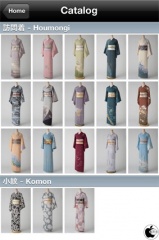 キモノカタログをタップすると、着せ替え出来る着物カタログが一覧表示され、着物の写真を見る事が出来ます。
