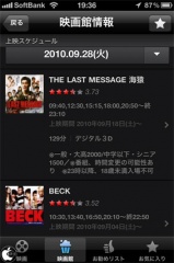 それぞれの映画館情報をタップすると、上映中の作品と、上映時間情報を見る事が出来るようになっています。