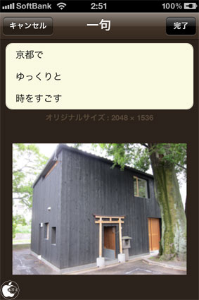 Kenji Tamuraが、iPhone/iPod touch用写真編集アプリ「photoikku KINARI フォト一句」を、App Storeにて販売を開始していたので試してみました。