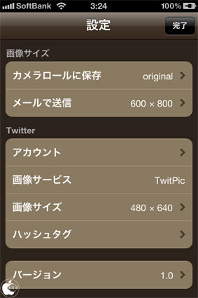 アクションボタンをタップすると、写真ライブラリーに保存したり、メール送信、Twitter(TwitPic)に投稿することが出来ます。