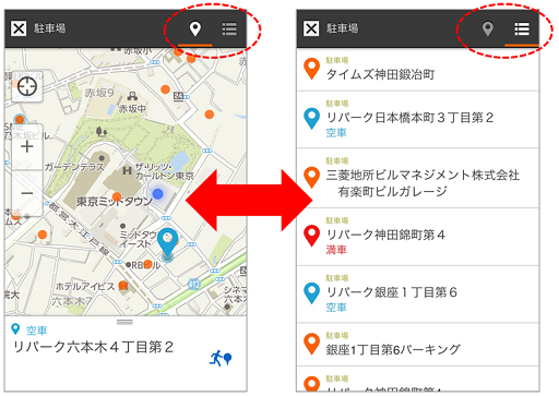 東京、大阪、名古屋の地域において、時間貸し駐車場の検索結果に、「満車」「空車」などのリアルタイム情報が表示されるようになっています。