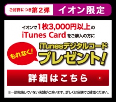 イオン店舗で購入された「iTunes Card - 3,000円」「iTunes Card - 5,000円」「iTunes Card - 10,000円」が対象となります。