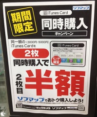 2012年09月15日(土) iTunes#iTunes_Card#ソフマップ#ビックカメラ ビックカメラ、ソフマップ、iTunes Card 2枚同時購入で2枚目半額キャンペーン開催中(9/23まで) ※本サイトは、アフィリエイト広告および広告による収益を得て運営しています。購入により売上の一部が本サイトに還元されることがあります。 ビックカメラと、ソフマップの店頭で、iTunes Card 2枚同時購入で2枚目半額キャンペーンが開催されています。 対象となるiTunes Cardは「3,000円」と「5,000円」で、キャンペーン期間は2012年9月23日までだそうです。 1人1日1回までの利用となり、3枚目以降は通常価格となります。