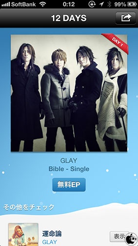 Appleが、2012年12月26日から2013年1月6日にかけて、毎日届く無料プレゼントキャンペーン「iTunes 12 DAYS プレゼント」の初日として「GLAY:Bible