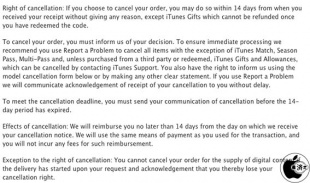 2014年12月30日(火) iTunes#Apple#iTunes Apple、ヨーロッパで、iTunes & App Store 購入アイテムを14日以内であれば無条件返金対応に ※本サイトは、アフィリエイト広告および広告による収益を得て運営しています。購入により売上の一部が本サイトに還元されることがあります。 9to5Macが、独iFunのレポートとして、イギリス、ドイツ、イタリア、フランスなどのヨーロッパ諸国で、iTunes & App Store 購入アイテムを14日以内に返金可能にしていると伝えています。 2014年12月16日付けて規約が変更されていて、レシート受理から14日以内であれば、iTunes、App Storeで購入したコンテンツに対して、無条件に返金要求を行なえると記載されています。 なお、iTunesギフトは対象外となっています。