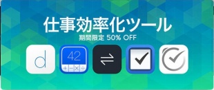 アイチューンズが、iOSアプリを50%オフで販売する「仕事効率化ツール」特集と、Mac用アプリを50%オフで販売する「GET PRODUCTIVE」を開催しています。