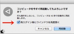 この再起動後にウインドウを再開するのをオフにするには、システム終了後、または再起動を選択した後に表示される「再ログイン時にウィンドウを再度開く」のチェックを外します。