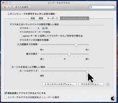 あと、ユニバーサルアクセスの「マウスとトラックパッド」タブの「カーソルのサイズ」使って、カーソルサイズを大きくすることが出来ます。