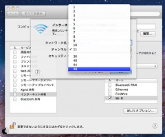 チャンネルのメニューをクリックすると、Mac OS X Snow Leopardまで2.4GHzネットワークチャンネルとして表示されていた「1〜11」の下に、5GHzネットワークチャンネル「36、40、44、48」が追加されているのが確認出来ます。