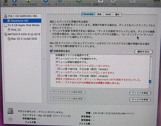 うわ!ハードディスクのツリー構造が損傷してしまったと思い、すぐさま、Mac OS X LeopardのインストールDVDから起動し、ディスクユーティリティで「ディスクを修復」を試みた。