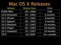 MacRumors.comが、LISA '08において、AppleのUNIXテクノロジー・エンジニアリングディレクターJordan Hubbard氏の「Mac OS X: From the Server Room to Your Pocket」プレゼンテーション資料として公開されているPDFの中に、Mac OS X Snow Leopardのリリースが、2009年第1四半期と記されていたと伝えています。
