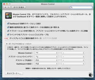 この全ての画面にFinderが表示されないようにするには、Mission Controlの「ディスプレイごとに個別の操作スペース」のチェックを外します。