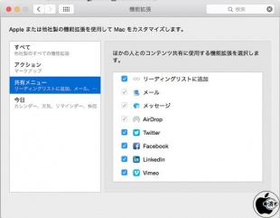 OS X Mavericksまで、Twitter、Facebook、LInkedinなど、予め指定されたSNS先にしか共有することが出来ませんでしたが、OS X Yosemiteからは、共有先を追加することが出来るようになりました。