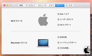 OS X Mavericksから継続して、サポートタブに、OS Xサポート情報にリンクする「OS Xリソース」、Macサポート情報にリンクする「Macintoshリソース」の項目が用意されています。