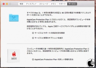 OS X Mavericksから継続して、サービスタブでは、Macintoshのシリアル番号を送信し、サービスとサポートの保障状況や、サービスと修理のオプションを表示してくれます。