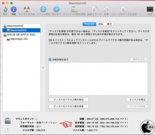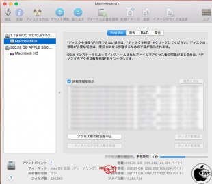 再起動後、ディスクユーティリティから情報を見ると、フォーマットが「論理パーティション」から「Mac OS 拡張(ジャーナリング)」などに表示が変わっていれば解除成功です。