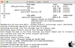 論理パーティションに戻す場合は、ターミナルから「diskutil corestorage convert "ドライブ名称"」(Macintosh HD など) と実行し再起動します。