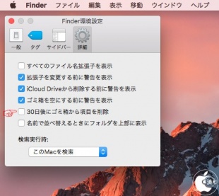 Finderの環境設定>詳細にある「30日後にゴミ箱から項目を削除」のチェックを外します。