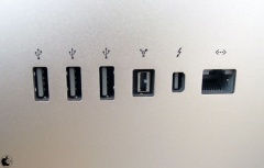 27-inch LED Cinema Displayと大きく異なるのは、背面側の接続ポートがUSB 2.0ポート x3個だったのが、FireWire 800ポート x1個、Thunderboltポート x1個、Gigabit Ethernetポート x1個がさらに追加されています。