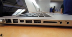 左側ポート類は従来型と変更はなく、MagSafe、GigaEthernet、FireWire 800、Thunderbolt、USB 3.0 x2、SDXCカードスロット、デジタル/アナログ対応オーディオ入出力ポートとなっています。
