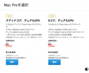 Apple Storeにおける「Mac Pro (Late 2013)」の出荷予定が、2014年1月から、受注受付開始後1日で2014年2月へと変更されています。
