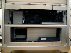 左側に大きく鎮座していた空冷ファンは、ほぼ半分の大きさになり、下段は、スライド式で、プロセッサとメモリーストットが載ったユニットを取出すことが出来るようになっています。