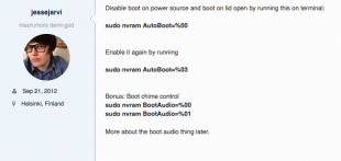 MacRumorsのフォーラム「[TUTORIAL] Disable auto boot on new Macbook Pros」によると、システム的に制御されており、ターミナル操作することで、自動起動を無効にしたり、起動時に起動音をオンにすることが可能だそうです。