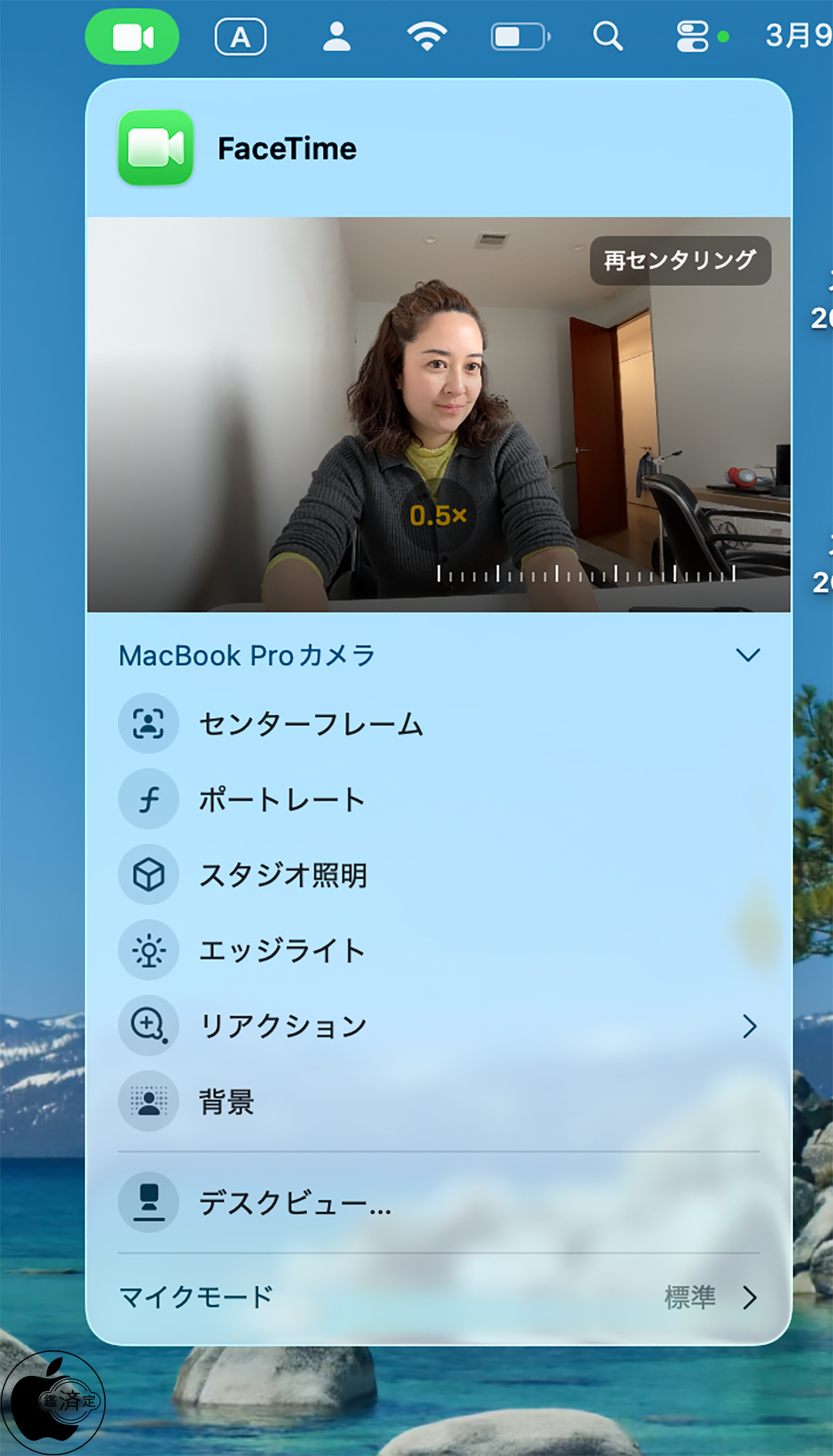 MacBook Pro (14-inch, M5 Pro, 2026)は、12MPフロントカメラが継続採用され、iPhoneの連携カメラと同様に、0.5〜3倍のズームコントロールが出来るようになっています。