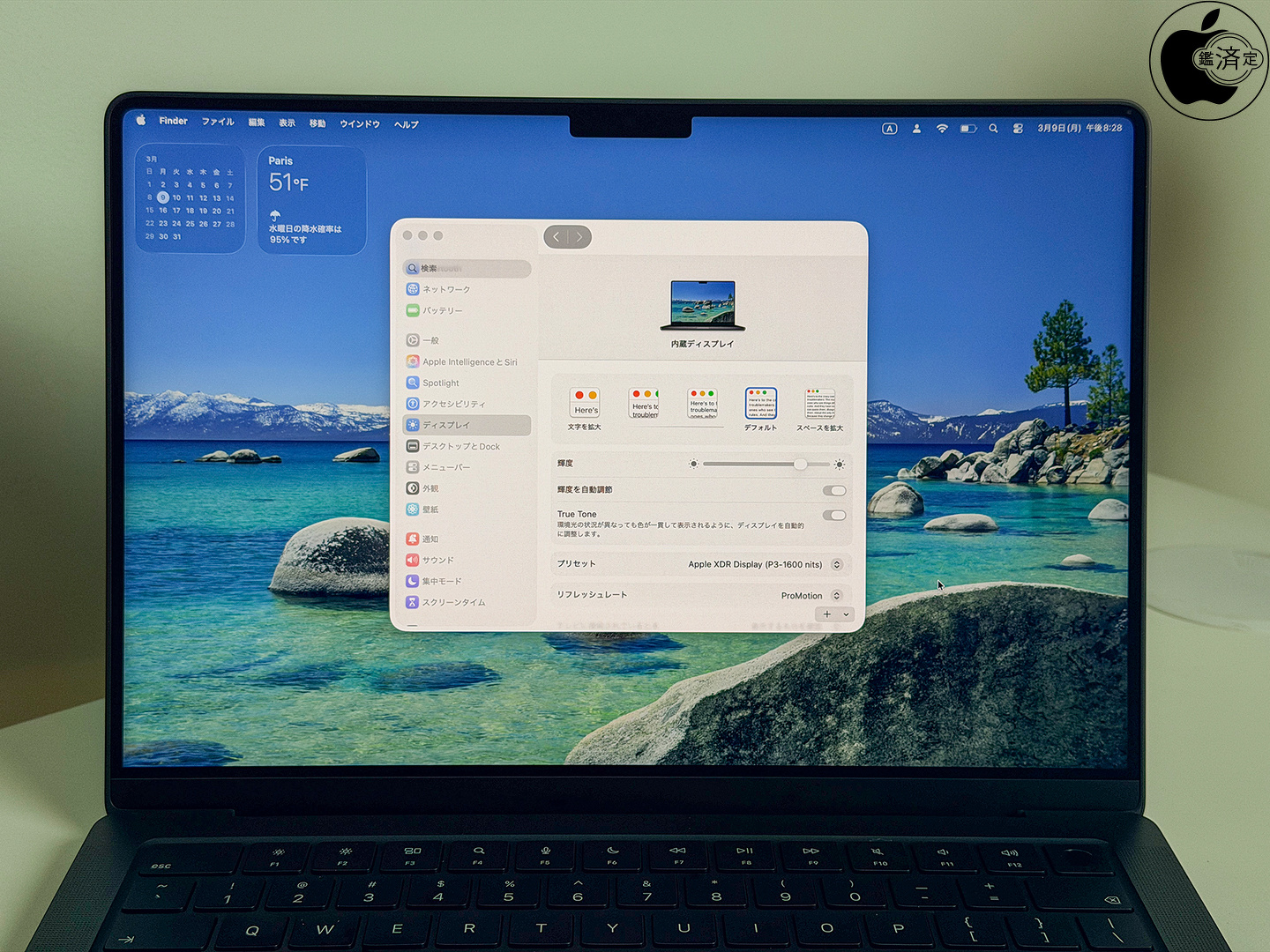 Liquid Retina XDRディスプレイは、IPSテクノロジー搭載14.2インチ(対角)LEDバックライトディスプレイ、3,024 x 1,964ピクセル標準解像度、224ppi、10億色対応、XDR輝度1,000ニトの持続輝度(フルスクリーン)、1,600ニトのピーク輝度(HDRコンテンツのみ)、SDR輝度600ニト、広色域(P3)、True Toneテクノロジーとなります。