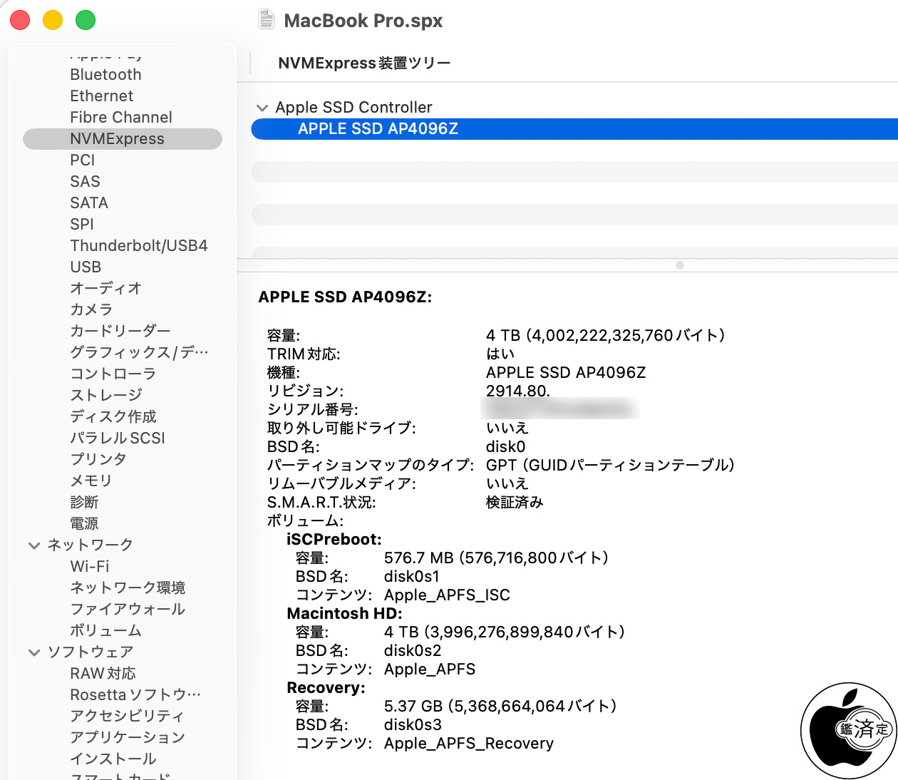 MacBook Pro (14-inch, M5)/M5の搭載SSDを確認したところ、4TBモデルのSSDは「APPLE SSD AP4096Z」で、MacBook Pro(14インチ, M4 Pro/M4 Max, 2024)と同じでした。