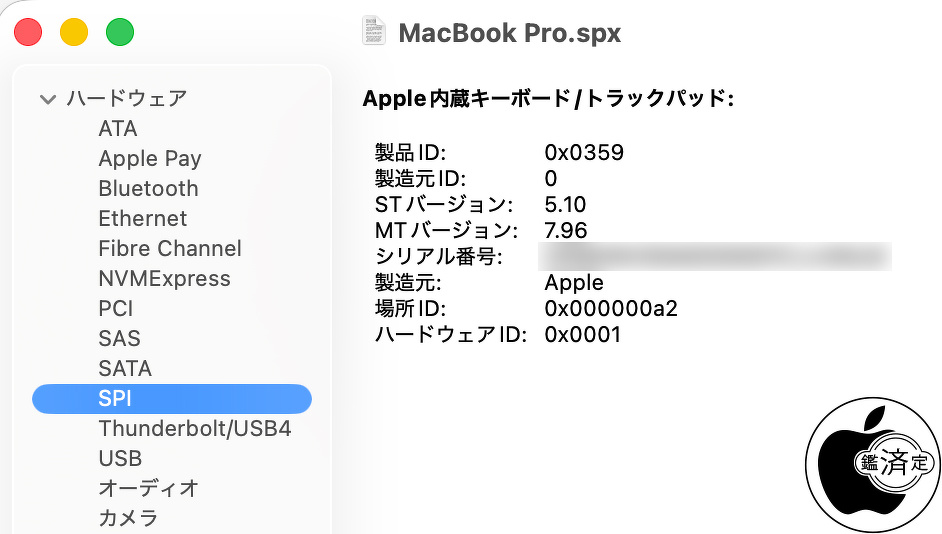 MacBook Pro (14-inch, M5 Pro, 2026)でAppleシステム情報を起動し、SPI装置ツリーで、Apple内蔵キーボード/トラックパッドを確認したところ、Apple内蔵キーボード/トラックパッドは、STバージョン5.10、MTバージョン7.96でした。