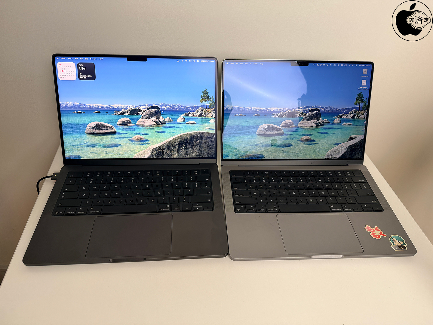 MacBook Pro (14-inch, M5 Pro, 2026)/Nano-textureディスプレイと、MacBook Pro (14-inch, 2023)/M2 Max/ディスプレイを上から比較してみました。
