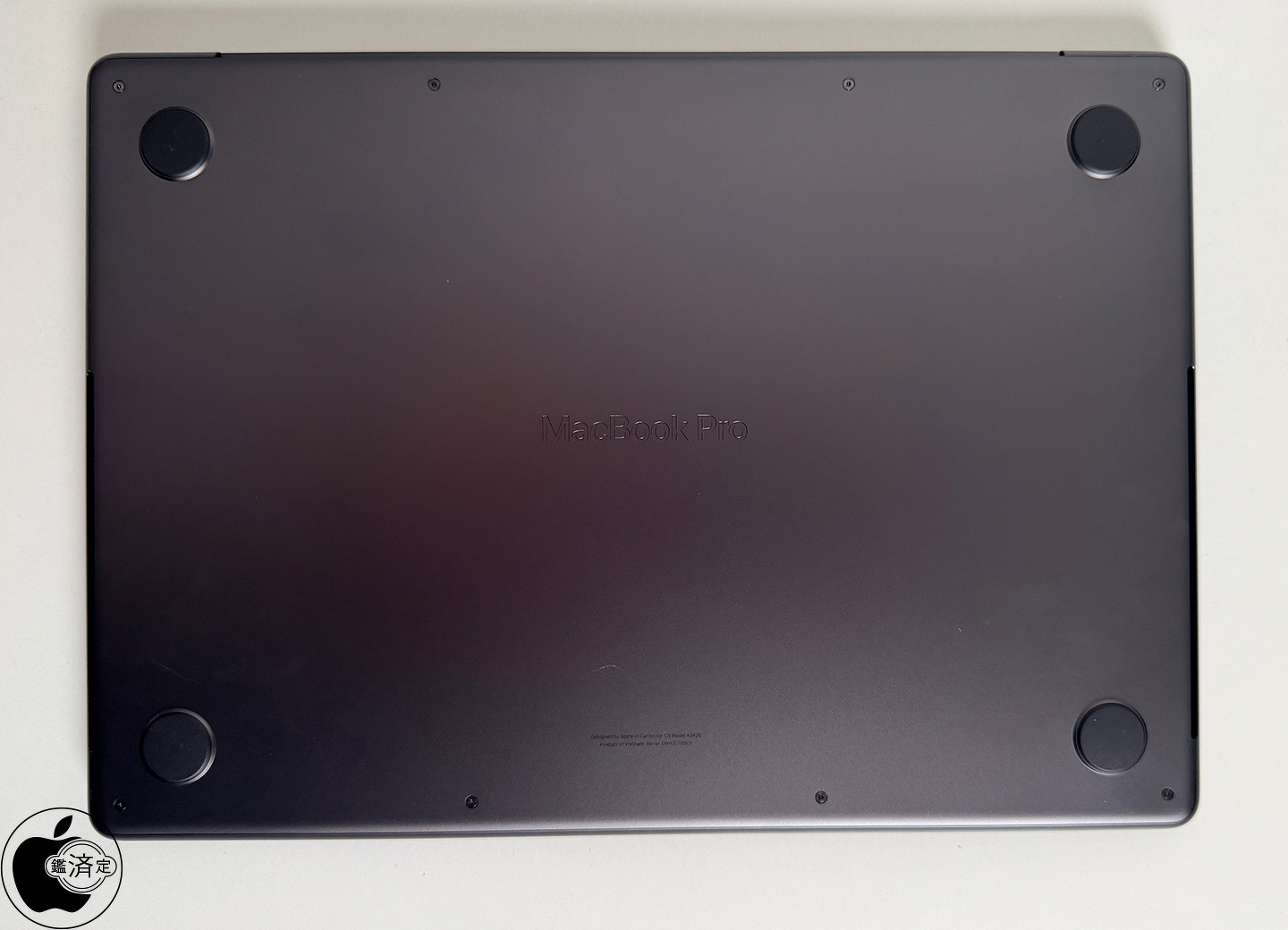 MacBook Pro (14-inch, M5 Pro, 2026)の底面は、MacBook Pro(14インチ, M4 Pro, 2024)と同様に「MacBook Pro」の刻印がされています。