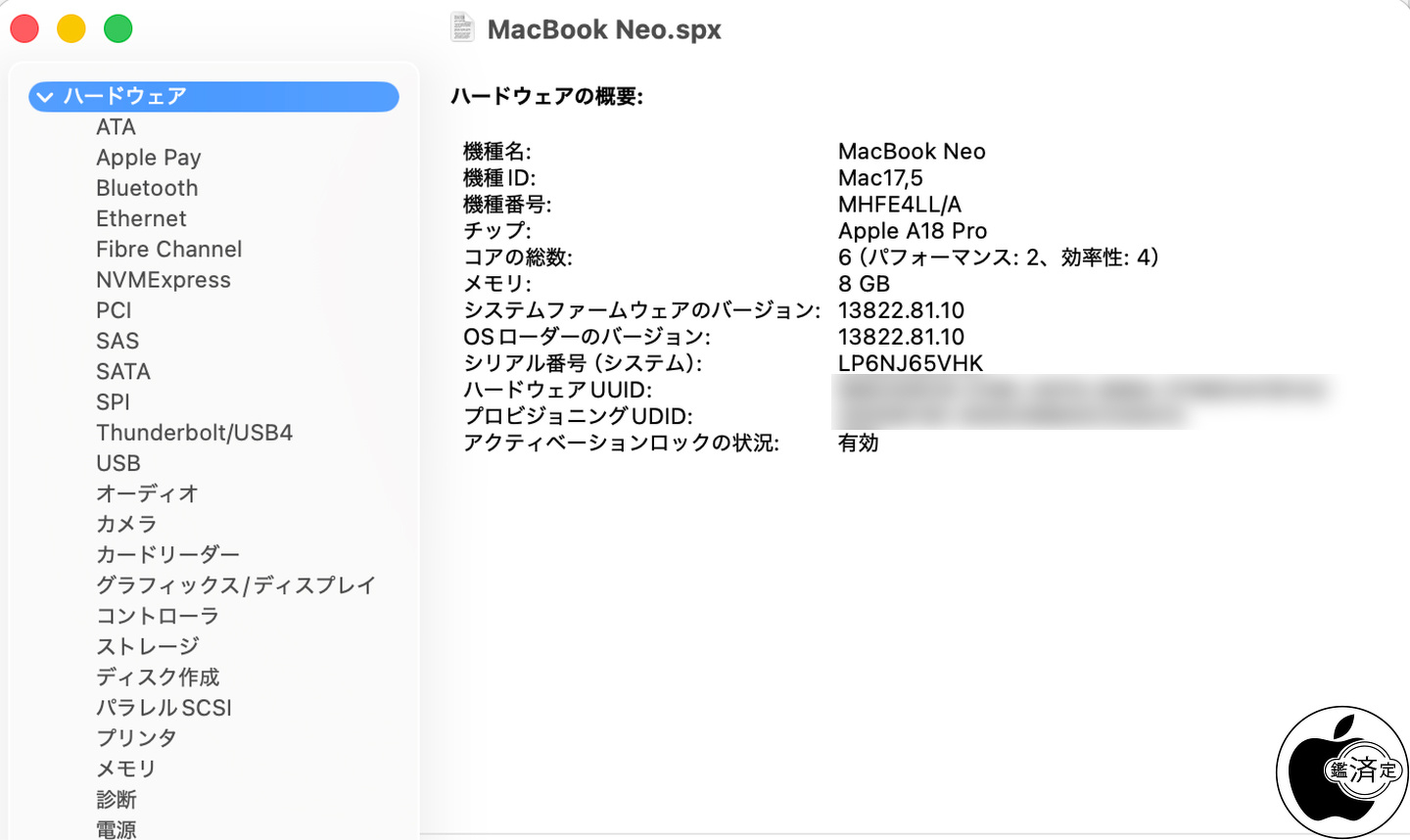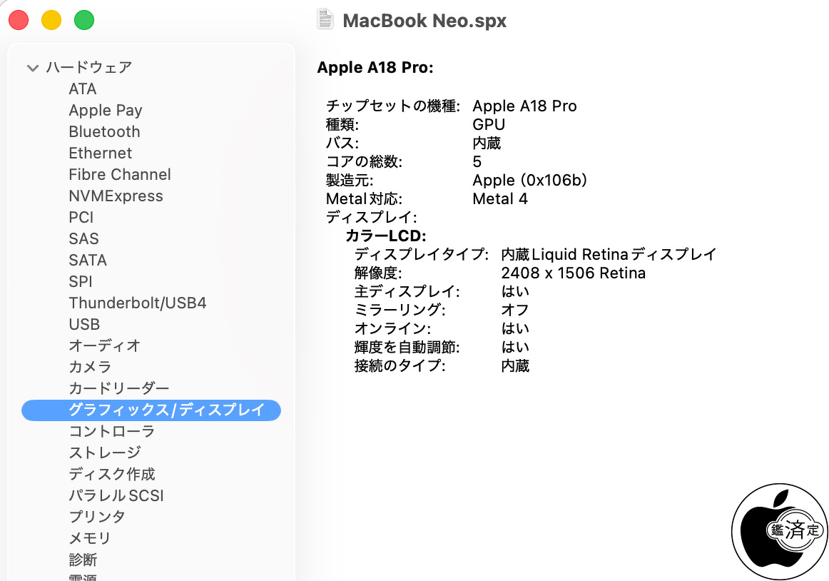 MacBook Neo (13-inch, A18 Pro)をシステム情報で確認したところ、機種IDはMac17,5、A18 ProチップのCPUは6コアでパフォーマンスコア2、効率性コア4となっています。