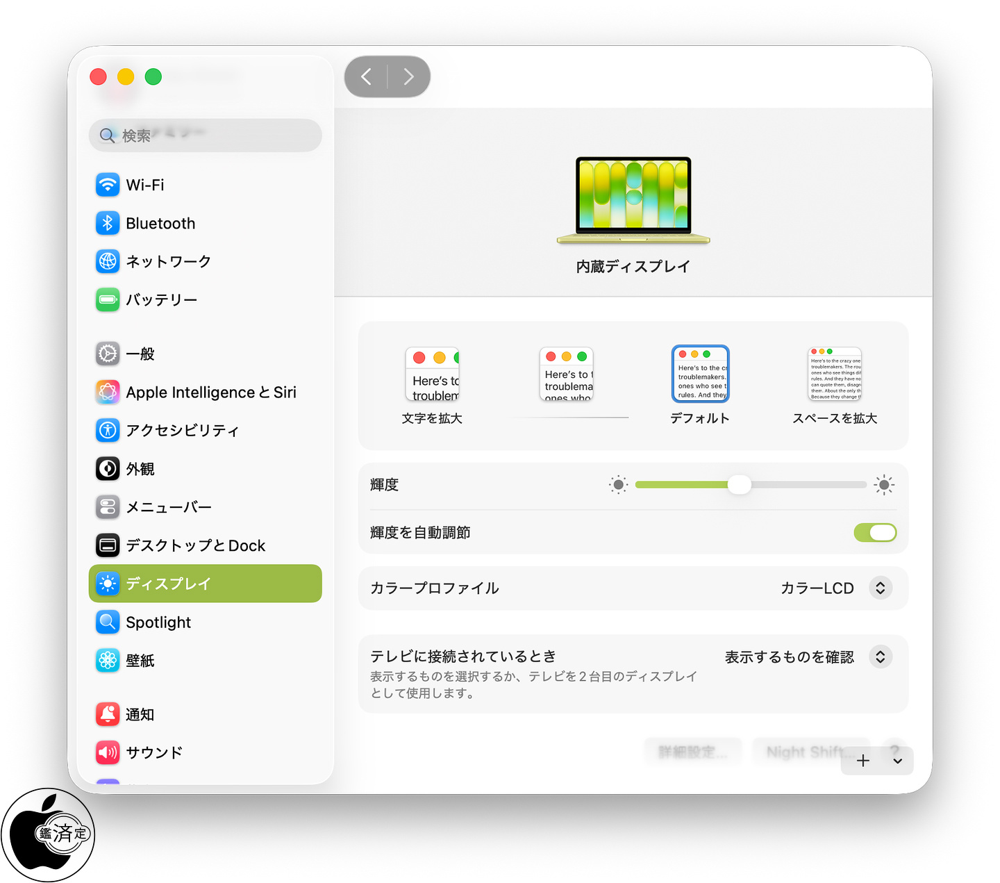 MacBook Neo (13-inch, A18 Pro)の設定>ディスプレイ>詳細設定で「解像度をリスト表示」をオンにし、さらに「すべての解像度を表示」をオンにした場合は、最大で2,408 x 1,506ピクセル解像度、72dpi表示が可能です。