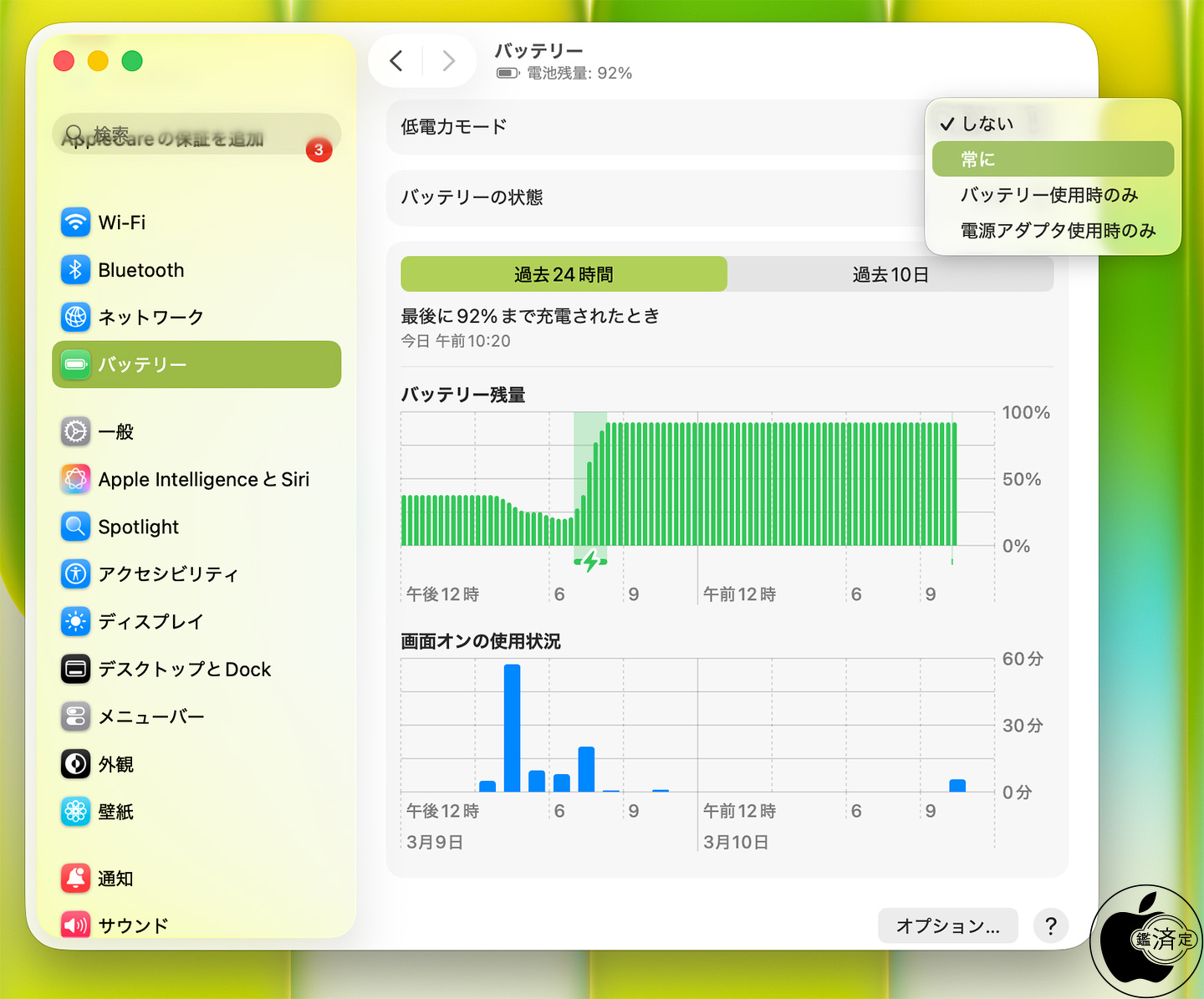 他のMacと同様に静音環境を必要とする作業のために、Macの電源を常に入れっぱなしにしている場合に消費電力を抑えることもできる「低電力モード」が利用できます。