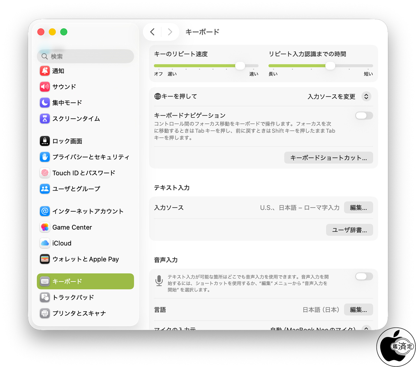 MacBook Neo (13-inch, A18 Pro)のシステム設定>キーボードを見てみると、バックライト非搭載のため、他のMacBook AirやMacBook Proにはある「環境光が暗い場合にキーボードの輝度を調整」「キーボードの輝度」「操作がなければキーボードのバックライトをオフにする」設定がありません。
