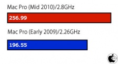 その結果、Mac Pro (Mid 2010)/2.8GHzは、Mac Pro (Early 2009)/2.26GHzと比較して、約1.3倍性能差があることが分かり、Mac Pro (Mid 2010)のコストパフォーマンスの高さが確認できます。