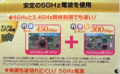 SSIDは2.4GHz帯と5GHz帯が用意されていて、5GHz帯を利用した場合、子機または端末側が11n/450Mbps/3ストリームに対応していれば450Mbps性能で利用でき、2.4GHz帯を利用した場合は 300Mbps性能で利用することが出来ます。