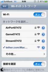 iPhone 4Sの設定>Wi-Fiネットワークから作成された「tether:XXXXX」を選択します。